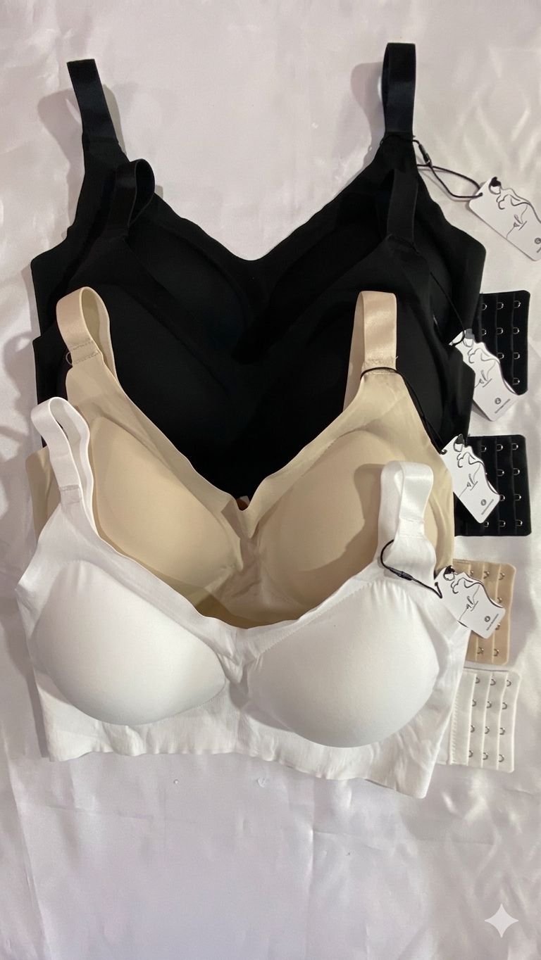 Corpiño sin aro, sin rellenos y sin costuras. Seamless. Contiene tazas premoldeadas que contienen y dan forma al busto sin sacrificar la comodidad. Con breteles regulables y laterales anchos para buen soporte. 4 hileras de broches reforzados en la espalda. Colores clasicos