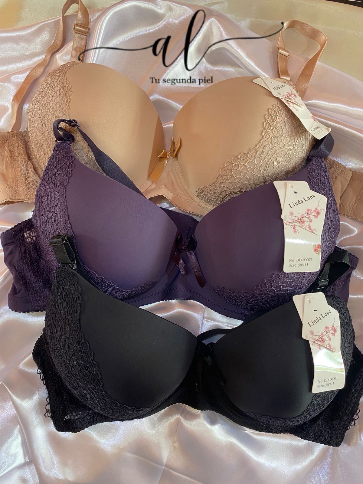Corpi con costura tradicional. Push up con aro sin relleno. Copa DD, es decir que tiene un par de centímetros más de lo normal, especial para busto grande